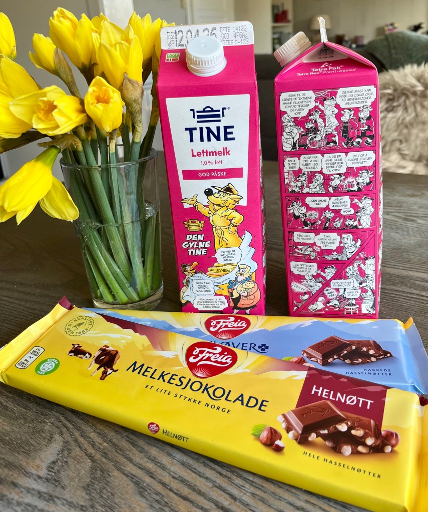 Tonight I won’t be heading to a wooden cabin in the forest or mountains as per the longstanding Norwegian tradition of Påskekrim (God Påske with Don Bartlett). No time. No cabin. Yet. But I have my favourite Freya chocolate, enthusiastic daffodils, warm blanket and working TV at home. Plus milk cartons with the annual mystery from Tine, one of Norway’s largest food companies and supplier of dairy products. Outside the last night’s snow has melted, seagulls are discussing the best places for laying their eggs, and my cat is supervising everything that’s happening (or not) in the garden.