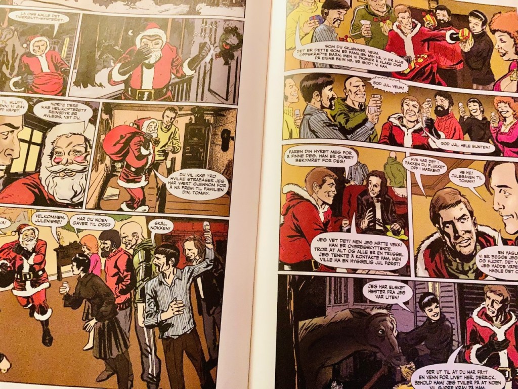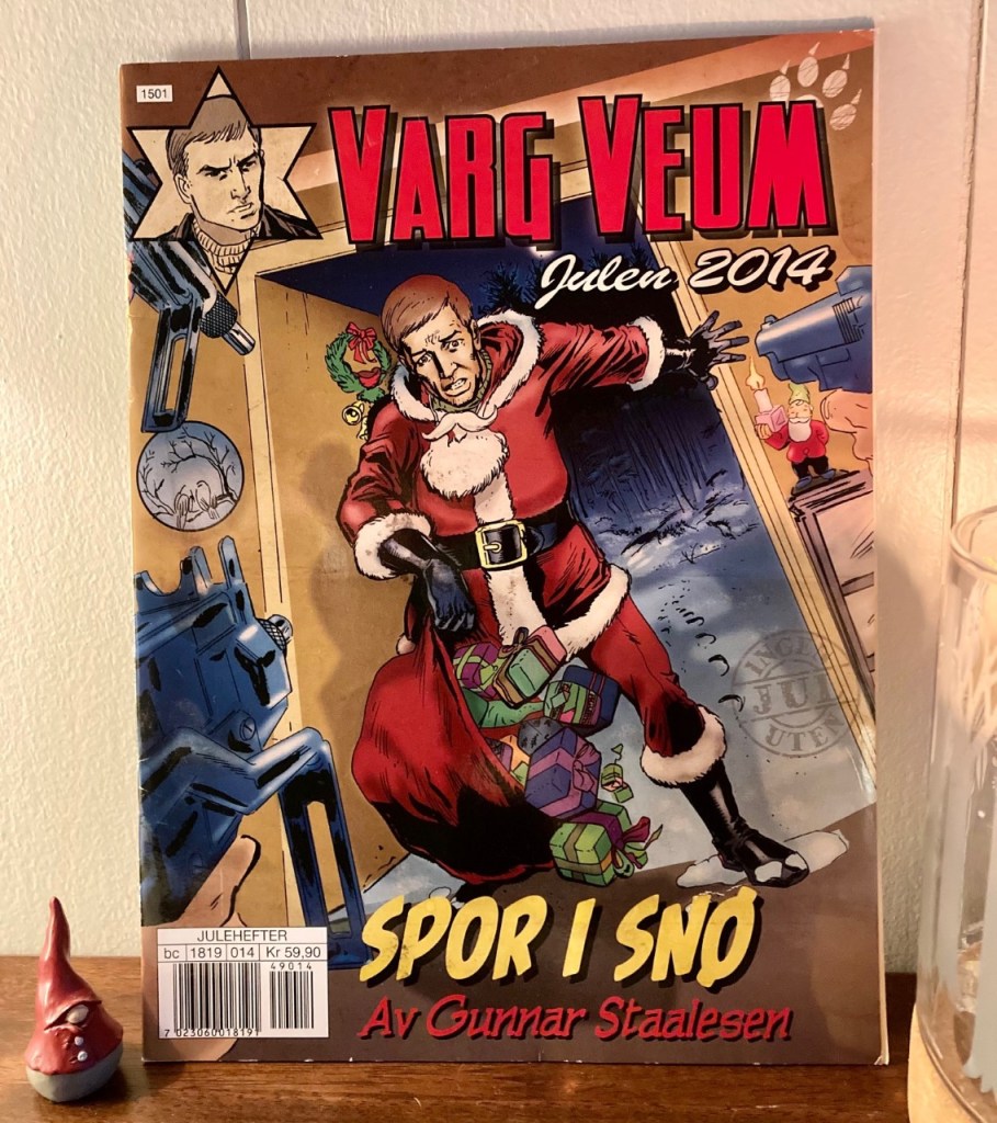 So what about Varg Veum and his Christmas celebrations? As he is living alone, most of the Christmas Eves he is by himself, drinking his aquavit and eating his pinnekjøtt alone, I am afraid. Now that he has grandchildren In Oslo, I hope he is invited to visit his son Thomas and his family in the capital, but I am not quite sure if he accepts the invitation. He is always a lone wolf, even on Christmas Eve. Together with the British artist Mike Collins and the editor Arild Wærness, I made four graphic arts Christmas magazines about Varg Veum between 2013 and 2016 and a collection of them in 2017, short mysteries taking place in the time around Christmas. The first one of these was based on a short story I wrote about Varg Veum in the 80’s, when he works as a Santa Clause in a big shopping Centre in Bergen and solves a smaller mystery there.