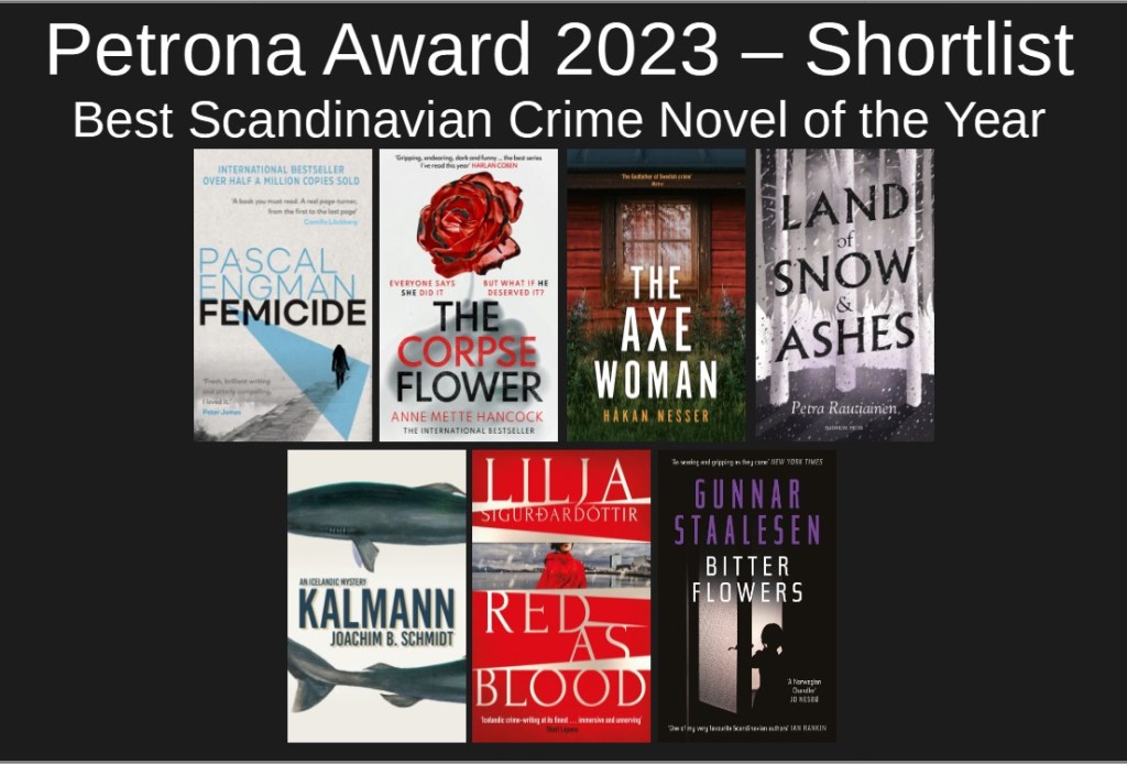 Seven impressive crime novels from Denmark, Finland, Iceland, Norway, Sweden and Switzerland have been shortlisted for the 2023 Petrona Award for the Best Scandinavian Crime Novel of the Year. The shortlist is announced today, Thursday 7 September and is as follows: