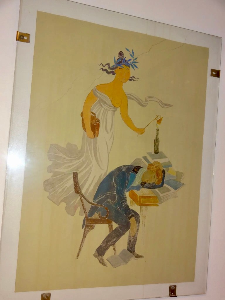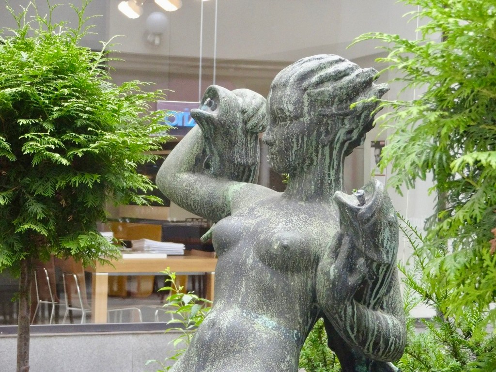 Walking all day in Helsinki added flavour and substance to what I’ve learnt about Tove’s life. The imposing building at Luotsikatu 4 was the childhood home and her parents’ studio. From there she often walked around the corner to buy tobacco for her father to what is now a tiny Café Signora. Then she lived at the House of Artists Lallukka from 1933 until 1942 when she moved to her first studio nearby, and two years later to a tower of a building at Ullanlinnankatu 1. The top floor flat was cold and drafty, the building hit in the bombings but the upper window showed a strip of sea. Tove lived and worked in this oasis until her death. The little gems scattered around the town include Domus Academica (providing student accommodation) which hosts two original murals painted by Tove, or a modest courtyard surrounded by modern office buildings. Hiding amongst the greenery a Viktor Jansson’s sculpture of Mermaid, modelled on young Tove, is standing in an empty fountain.