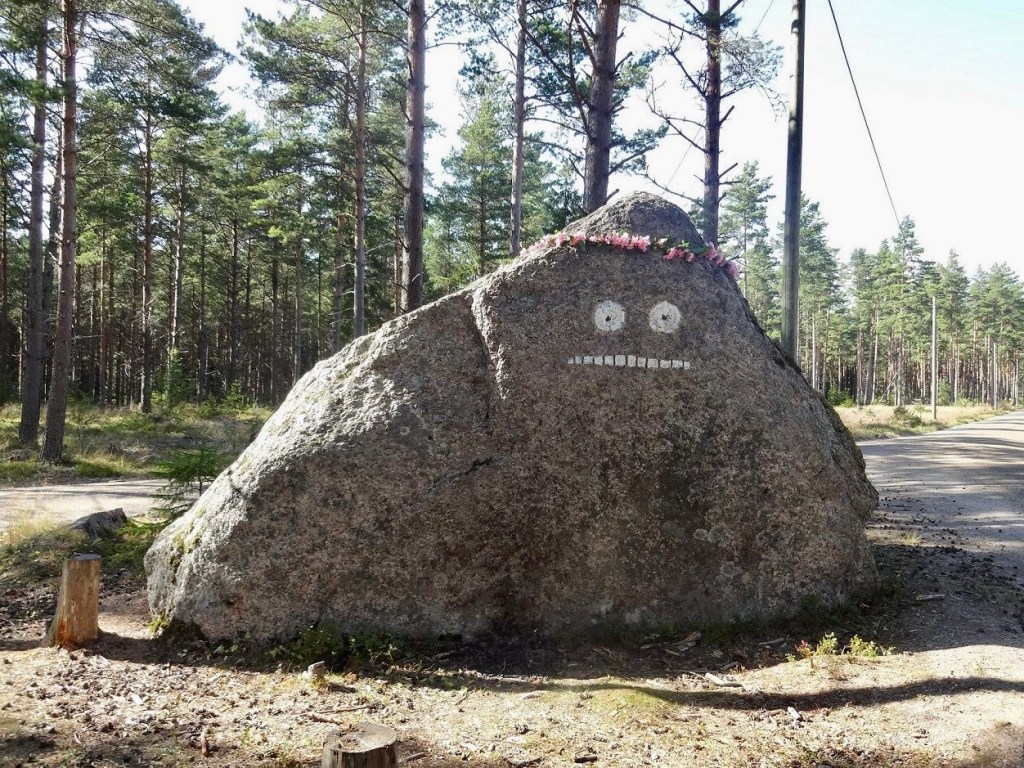 Another adventure awaited in a form of Gerd, wonderful Finnish Swede, living on one of the islands of the archipelago Pellinki, who had arrived in a big taxi to collect us. We made online arrangements for our trip from Porvoo to the small place on the coast. Gerd knew the archipelago, its history, people, roads, landscape. She stopped at the village store where Tove used to do basic shopping, coming by boat from her island Klovharun. On the way back, taking a slightly different route, she suggested stopping for a moment to see ‘Mårran’. And so we drove into the woods and suddenly there was a huge boulder in an unusual shape, a wreath of flowers on its top, with luminous painted eyes and teeth, and it was a happy Groke! A new Finnish word to add to my limited vocabulary.