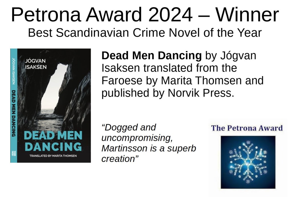 It was thrilling to translate the Faroese novel Dead Men Dancing and a great honour to receive the Petrona Award. I am privileged to find myself in the company of the master crafters of stories and languages shortlisted this year, congratulations to all! My thanks first and foremost to Jógvan Isaksen for keeping us in suspense, as he navigates the rugged outlines of the psychology and wild shores of the Faroe Islands. This book offers a fascinating window into regional tensions in the archipelago and historical tensions in the Kingdom of Denmark. Thank you to the passionate Norvik team for expert guidance and editorial advice. And to Richard and Jane for your patience and boundless enthusiasm for everything, even the difference between rowing boats and oared boats.