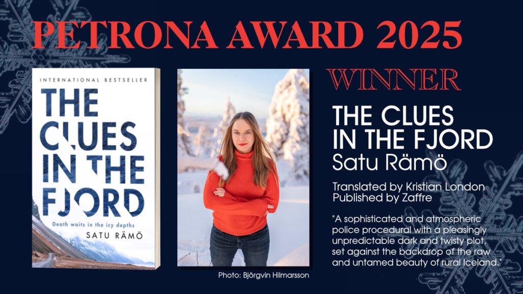 THE CLUES IN THE FJORD by Satu Rämö translated from the Finnish by Kristian London and published by Zaffre. Satu Rämö will receive a trophy, and both the author and translator will receive a cash prize. The Petrona team would like to thank David Hicks for his sponsorship of the Petrona Award.