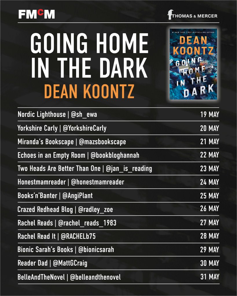 Having read fairly recently After Death and The Bad Weather Friend, I was back in the gloriously strange world of Dean Koontz, the well-blended mixture of excellent storytelling with elements of thriller, paranormal horror and suspense. There are plenty of references to literature, film and popular culture, as well. As always Koontz creates a plot that is both impeccable and surprising but I will not dive into analysing what’s going on in the novel. You’ve got to read it – and the bloggers who joined this blog tour will whet your appetite. Instead I want to mention what I also enjoyed about Going Home in the Dark: the omnipresent narrator who gives updates on the writing process and the context of various situations. I’m certain this would work in other books, too, as long as it fits with the overall stylistics. Here it’s playful and fun, and sometimes eye-opening. Koontz seems to genuinely care for his main characters Four Amigos – artistic creative souls: actress, writer, painter and songwriter – and so explains things behind the scenes, to some degree. Of course this doesn’t mean that the reader must agree with everything but it allows for a moment of reflection. Additionally it gives plenty of space for dark humour. Here’s an example which perfectly shows the thinking of both the plot and the mechanisms of writing: